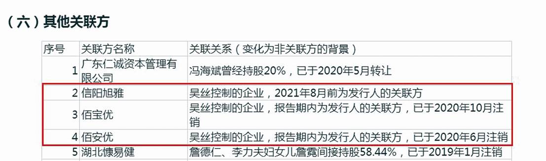 事實上,從企查查顯示的工商登記信息看,信陽旭雅即廣東旭乾資產管理有限公司,與佰寶優都一直屬于吳絲控制下的企業。從科萊瑞迪2021年12月起歷次披露的招股書可見,信陽旭雅、佰寶優、佰安優均為吳絲控制的企業(見圖三)。