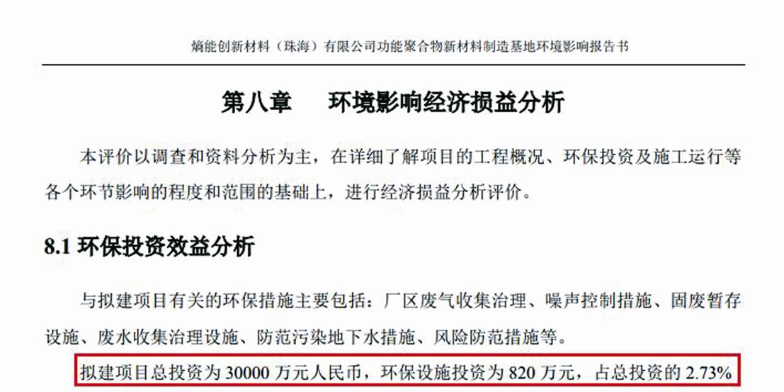 然而值得注意的是,《大眾證券報》明鏡財經工作室記者調查發現,公司招股書披露的包含核心募投項目的熵能珠海基地項目投資總額3.90億元,明顯高于該項目環評報告書顯示的投資金額;同時,核心募投項目的環保投資更是超過整個熵能珠海基地項目環評報告顯示的環保投資金額。