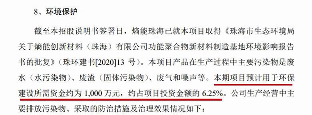 公司招股書中則稱,“截至本招股說明書簽署日,熵能珠海已就本項目取得《珠海市生態環境局關于熵能創新材料(珠海)有限公司功能聚合物新材料制造基地環境影響報告書的批復》(珠環建書[2020]13 號)。本項目產品在生產過程中主要污染物是廢水(水污染物)、廢渣(固體污染物)、廢氣和噪聲等。本期項目預計用于環保建設所需資金約為1000萬元,約占項目投資金額的6.25%。”(見圖五)