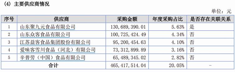 華士食品2018年年報顯示,華士食品當年的前五大供應商分別為山東聚九元食品有限公司、山東眾客食品有限公司、江蘇益客食品集團股份有限公司、愛味客雪川食品(河北)有限公司和辛普勞(中國)食品有限公司,采購金額分別為1.31億元、1.01億元、9520萬元、7331萬元和6549萬元(見圖四)。以南王科技2018年對華萊士的銷售金額8037.54萬元來看,南王科技應位列華士食品第四大客戶。