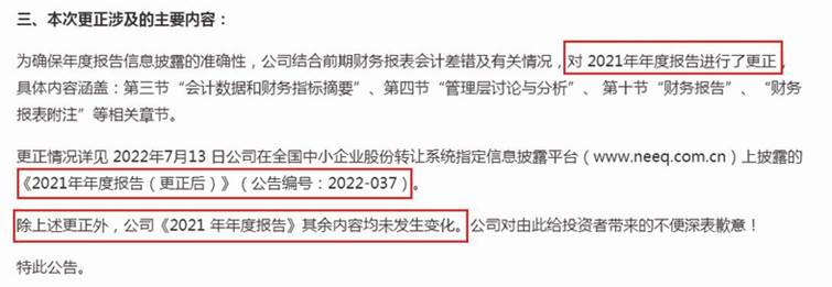 更值得注意的是,博菱電器更正公告還出現了錯誤。博菱電器2022年7月13日晚間披露的2019年年度報告更正公告中,卻表示對2021年年報進行了更正(見圖三)——“為確保年度報告信息披露的準確性,公司結合前期財務報表會計差錯及有關情況,對2021年年度報告進行了更正,具體內容涵蓋:第三節‘會計數據和財務指標摘要’、第四節‘管理層討論與分析’、 第十節‘財務報告’、‘財務報表附注’等相關章節。”