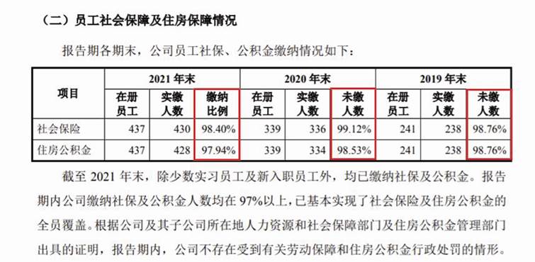 翻閱招股書可以發現,文中存在不止一處的低級錯誤,一是將員工社保住房公積金繳納比例寫成未繳人數。悅普集團招股書中披露“員工社會保障及住房保障情況”時,圖表方式介紹2019-2021年底社保、住房公積金繳納情況中,2020年末、2019年末均將繳納比例寫成未繳人數(見圖一)。