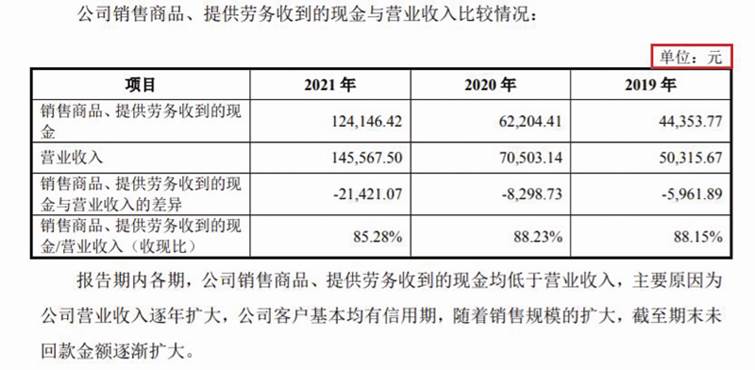 二是公司招股書中存在將貨幣單位“萬元”寫成“元”的錯誤。招股書中介紹“公司銷售商品、提供勞務收到的現金與營業收入比較情況”時,圖表中的貨幣單位為元,實際應當是萬元(見圖二)。例如按照此貨幣單位,2021年營收為145567.50元,明顯錯誤,而且對比其他處也可知,此處應當為萬元。