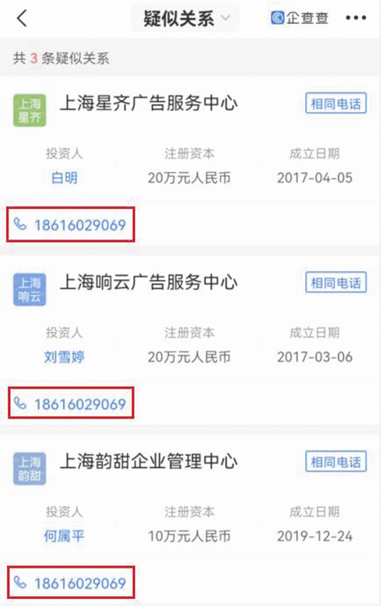 企查查查詢的工商登記信息顯示,上海韻程(曾用名寧波梅山保稅區云成投資合伙企業(有限合伙),2020年5月后變更為現名),向當地市監機構提交的2020年年報顯示聯系電話為18616029069,相同電話企業還有上海星齊廣告服務中心(以下簡稱“上海星齊”)、上海響云廣告服務中心(以下簡稱“上海響云”)、上海韻甜企業管理中心(以下簡稱“上海韻甜”)(見圖四)。從企業年報顯示的通訊地址看,上海韻程成立初期的地址在寧波,2020年起遷至上海市嘉定區真南路4268號2幢J10750室。