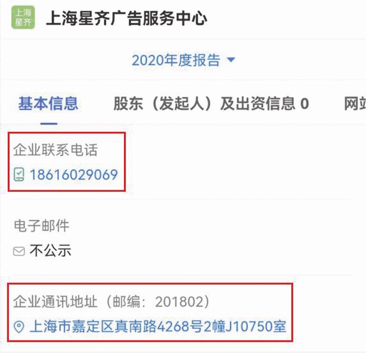 記者進一步查詢發現,上海星齊向當地市監機構提交的2020年、2021年企業年報顯示,除了聯系電話為18616029069,通訊地址也與上海韻程一模一樣——上海市嘉定區真南路4268號2幢J10750室(見圖五)。而上海星齊成立于2017年4月5日,白明持股100%,經營范圍為設計、制作、代理、發布各類廣告等,成立后未發生過投資人、股權、經營范圍等變更。