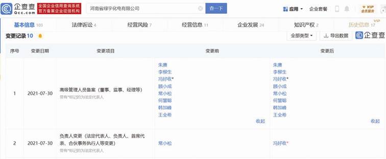 企查查顯示,綠宇化電實控人、最終受益人均為常小松,其持有綠宇化電30%股份(認繳出資額300萬元),此外還有多個持股1%的股東,另據變更記錄,2021年7月負責人由常小松變更為馮好收(見圖二、圖三)。2012年,江河紙業改制為股份有限公司后,常小松經股東提名成為公司董事。