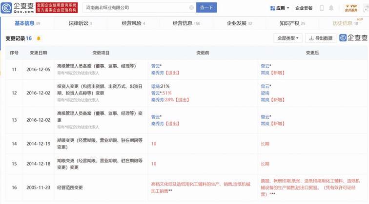 收購的另一家企業——南北紙業,也與常小松有關。收購南北紙業前,南北紙業股東分別為曾云、常嵐、梁琦、劉鑄紅,持股比例依次為51.45%、27.70%、19.77%、1.09%。常嵐與江河紙業間接股東、董事常小松系父女關系。企查查顯示,秦秀芳(系常小松配偶)也曾為南北紙業股東(見圖五)。