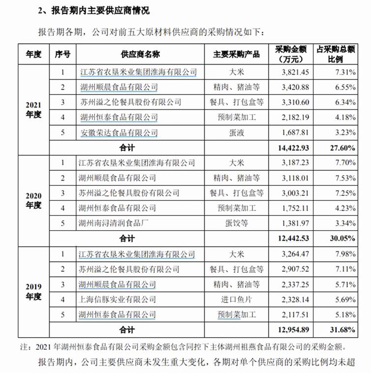 由此引發一系列疑問——上述罰款中聲稱的交由該企業代工的湖州恒某公司是否為老娘舅的子公司?上述處罰事件是否涉及為老娘舅或子公司代工產品?老娘舅與湖州恒泰食品有限公司的合作開始于哪一年?在湖州恒泰食品有限公司2018年因食品安全被罰之后,為何其在2019—2021年仍然能登上老娘舅前五大原材料供應商的名單,公司對其采購金額較2018年是增還是減?老娘舅的采購金額占湖州恒泰食品有限公司的銷售的比例究竟是多少?