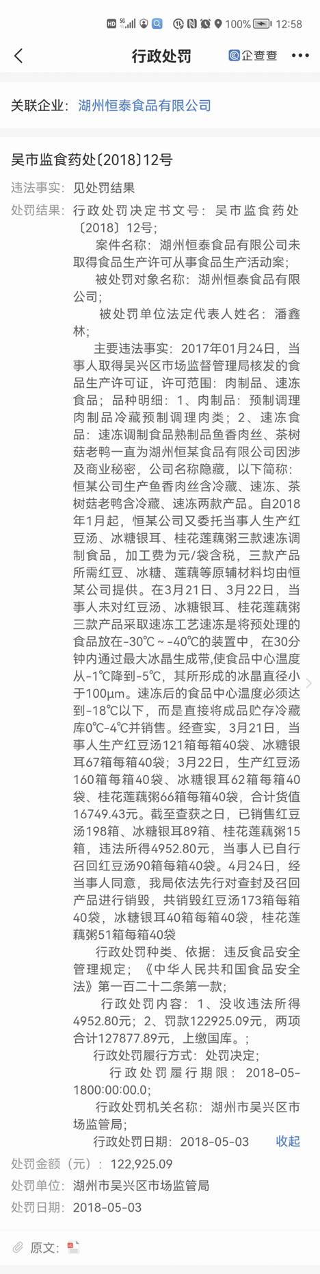 企查查顯示,上述重要的供應商,在2018年5月曾被湖州市吳興區市場監管局處以合計12.79萬元的罰款,罰款事由為:2017年1月24日,其取得吳興區市場監督管理局核發的食品生產許可證,許可范圍:肉制品、速凍食品;品種明細:1、肉制品:預制調理肉制品【冷藏預制調理 肉類】;2、速凍食品:速凍調制食品【熟制品(魚香肉絲、茶樹菇老鴨)】,一直為湖州恒某食品有限公司(因涉及商業秘密,公司名稱隱藏,以下簡稱:恒某公司)生產魚香肉絲(含冷藏、速凍 )、茶樹菇老鴨(含冷藏、速凍)兩款產品。自2018年1月起,恒某公司又委托當事人生產紅豆湯、冰糖銀耳、桂花蓮藕粥三款速凍調制食品,加工費為*元/袋(含稅),三款產品所需紅豆、冰糖、 蓮藕等原輔材料均由恒某公司提供。在3月21日、3月22日,當事人未對紅豆湯、冰糖銀耳、桂花蓮藕粥三款產品采取速凍工藝(速凍是將預處理的食品放在-30℃~-40℃的裝置中,在30分鐘內通過最大冰晶生成帶,使食品中心溫度從-1℃降到-5℃,其所形成的冰晶直徑小于100μm。速凍后的食品 中心溫度必須達到-18℃以下),而是直接將成品貯存冷藏庫(0℃-4℃)并銷售。經查實,3月21日,當事人生產紅豆湯121箱(每箱40袋)、冰糖銀耳67箱(每箱40袋);3月22日,生產紅豆湯160箱(每箱40袋)、冰糖銀耳62箱(每箱40袋)、桂花蓮藕粥66箱(每箱40袋),合計貨值16749.43元。截至查獲之日,已銷售紅豆湯198箱、冰糖銀耳89箱、桂花蓮藕粥15箱,違法所得4952.80元,當事人已自行召回紅豆湯90箱(每箱40袋),4月24日,經當事人同意,依法先行對查封及召回產品進行銷毀,共銷毀紅豆湯173箱(每箱40袋),冰糖銀耳40箱(每箱40袋),桂花 蓮藕粥51箱(每箱40袋)。并因此違反食品安全相關法規,處于相應行政處罰,沒收違法所得4952.80元并罰款122925.09元,兩項合計127877.89元,上繳國庫(見圖二)。