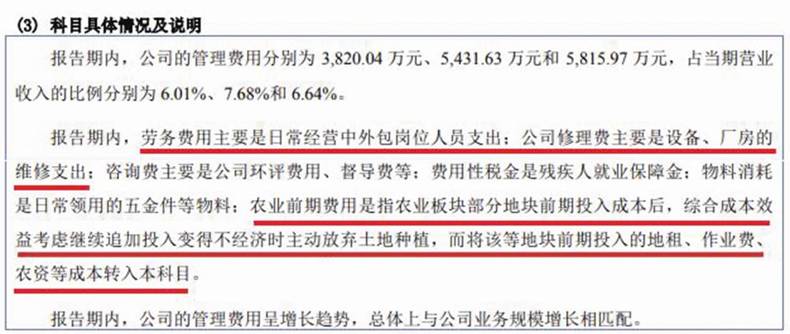 從招股書能查詢到的公司勞務費用或勞務費來看,基本來自管理費用中的勞務費用。報告期內,管理費用中的勞務費用主要是公司日常經營中外包崗位人員支出(見圖三)。2019-2021年,公司管理費用中,勞務費用分別為440.13萬元、706.33萬元、654.74萬元,農業前期費用分別為132.16萬元、245.15萬元、200.12萬元(見圖四)。而公司銷售費用中的勞務費在2019年沒有,其余兩年只有4萬元至29萬元不等。