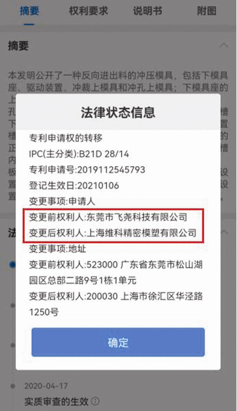 圖三:維科精密受讓“一種反向進出料的沖壓模具”發明專利截圖