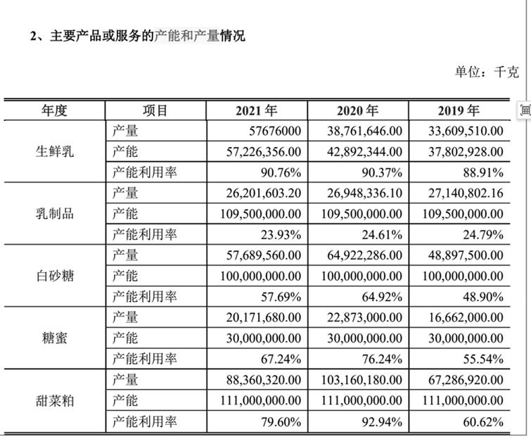 而按騎士乳業(yè)披露的銷售金額和銷售單價來計算,2019-2021年,公司銷售的生鮮乳分別為32389614.75千克、37778783.82千克、47717283.24千克,銷量占公司相關產(chǎn)能的比例為85.68%、88.08%、83.38%。乳制品的銷量分別為25321555.47千克、24663032.04千克、24486270.27千克、銷量占公司相關產(chǎn)能的比例為23.12%、22.52%、22.36%。