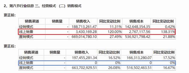 而對于線上銷售收入直接變更為零,變更幅度很難用會計差異來解釋,公司也表示為“嚴格按照證監(jiān)會及北交所相關規(guī)定,真實、準確、完整披露公司相關信息,不存在相關數(shù)據(jù)作假情形。”