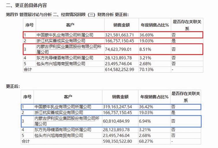 更驚訝的是,此次更正僅僅一天之后,騎士乳業(yè)于2022年6月29日再次發(fā)布2021年報更正公告,針對大客戶中國蒙牛乳業(yè)有限公司所屬公司的銷售金額進行了更正,對其銷售數(shù)據(jù)由原來的3.22億元更正為3.19億元,同時更正的還有對內蒙古伊利實業(yè)集團股份有限公司所屬公司的銷售數(shù)據(jù),由更正前的7462.38萬元變更為6081.05萬元,更正幅度超過20%(見圖三)。