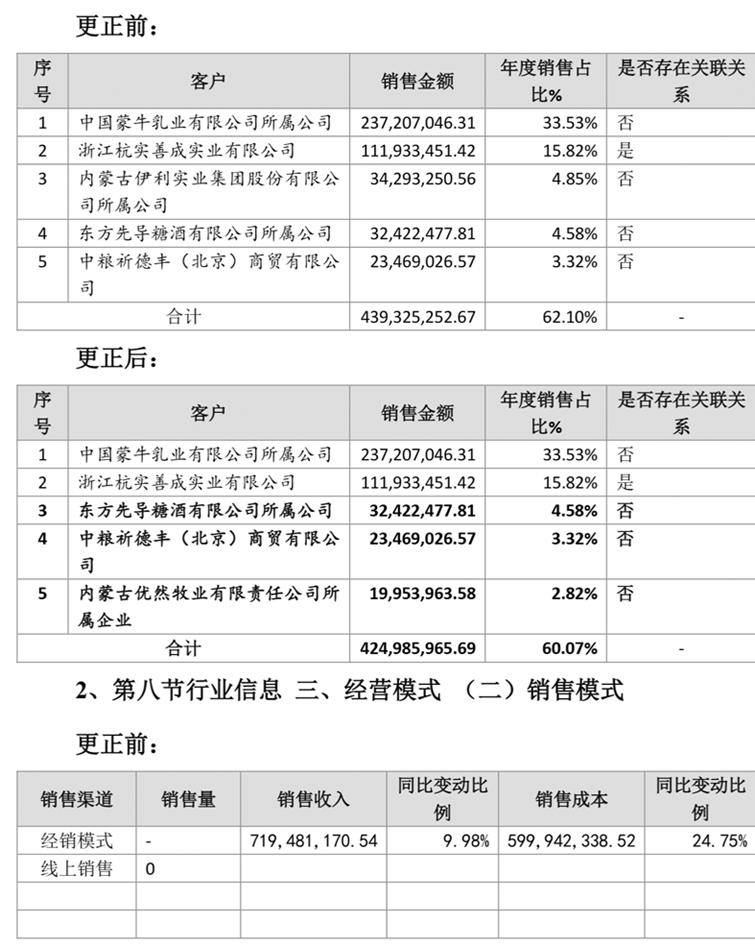 2022年6月20日和6月28日的深夜,騎士乳業(yè)還更正了公司2020年年報,其中6月28日對當年度公司的大客戶和經(jīng)銷模式數(shù)據(jù)也進行了大幅度更正,經(jīng)銷模式數(shù)據(jù)由更正前的7.19億元變更為1.69億元。