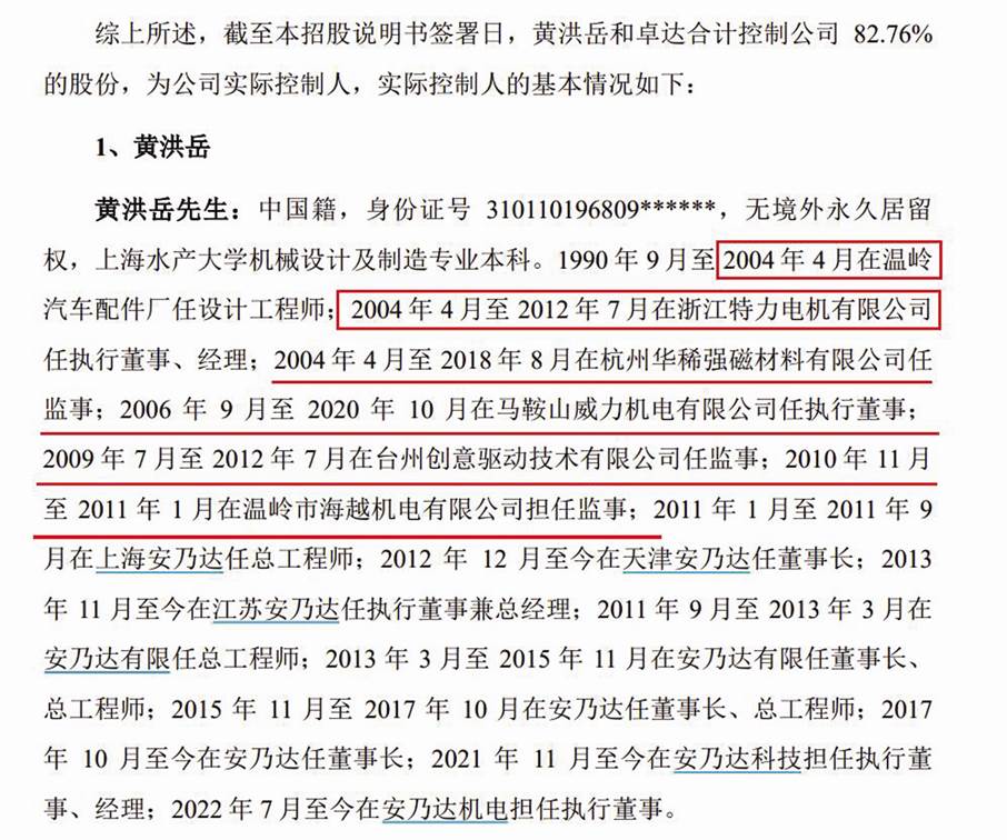 對黃洪岳簡歷披露時,公司招股書內容為:“黃洪岳先生:中國籍,身份證號310110196809******,無境外永久居留權,上海水產大學機械設計及制造專業本科。1990年9月至2004年4月在溫嶺汽車配件廠任設計工程師;2004年4月至2012年7月在浙江特力電機有限公司任執行董事、經理;2004年4月至2018年8月在杭州華稀強磁材料有限公司任監事;2006年9月至2020年10月在馬鞍山威力機電有限公司任執行董事;2009年7月至2012年7月在臺州創意驅動技術有限公司任監事;2010年11月至2011年1月在溫嶺市海越機電有限公司擔任監事;2011年1月至2011年9月在上海安乃達任總工程師;2012年12月至今在天津安乃達任董事長;2013年11月至今在江蘇安乃達任執行董事兼總經理;2011年9月至2013年3月在安乃達有限(即安乃達前身,下同)任總工程師;2013年3月至2015年11月在安乃達有限任董事長、總工程師;2015年11月至2017年10月在安乃達任董事長、總工程師;2017年10月至今在安乃達任董事長;2021年11月至今在安乃達科技(系安乃達子公司)擔任執行董事、經理。”(見圖一)
