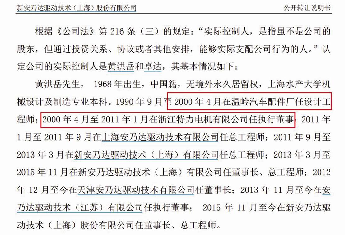 而此前公開轉讓說明書披露為:“黃洪岳先生,1968年出生,中國籍,無境外永久居留權,上海水產大學機械設計及制造專業本科。1990年9月至2000年4月在溫嶺汽車配件廠任設計工程師;2000年4月至2011年1月在浙江特力電機有限公司任執行董事;2011年1月至2011年9月在上海安乃達驅動技術有限公司任總工程師;2011年9月至2013年3月在新安乃達驅動技術(上海)有限公司任總工程師;2013年3月至2015年11月在新安乃達驅動技術(上海)有限公司任董事長、總工程師;2012年12月至今在天津安乃達驅動技術有限公司任董事長;2013年11月至今在安乃達驅動技術(江蘇)有限公司任執行董事;2015年11月至今在新安乃達驅動技術(上海)股份有限公司任董事長、總工程師。”(見圖二)