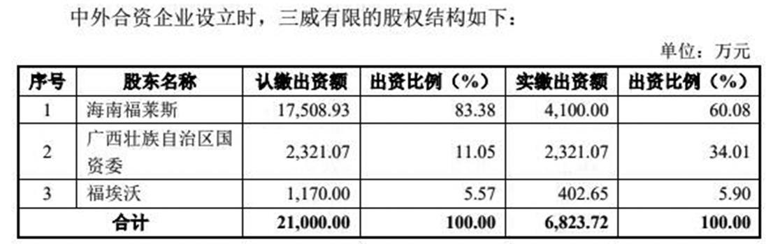 2008年3月21日,為解決林木資產(chǎn)無法辦理產(chǎn)權過戶的問題,三威有限召開股東會并作出決議,同意海南福萊斯將其持有的三威有限41.33%的認繳股權(對應出資額 8678.93萬元)轉(zhuǎn)讓給梧州福萊斯,這樣一來,公司股東就變更為海南福萊斯、梧州福萊斯、廣西壯族自治區(qū)國資委、福埃沃。