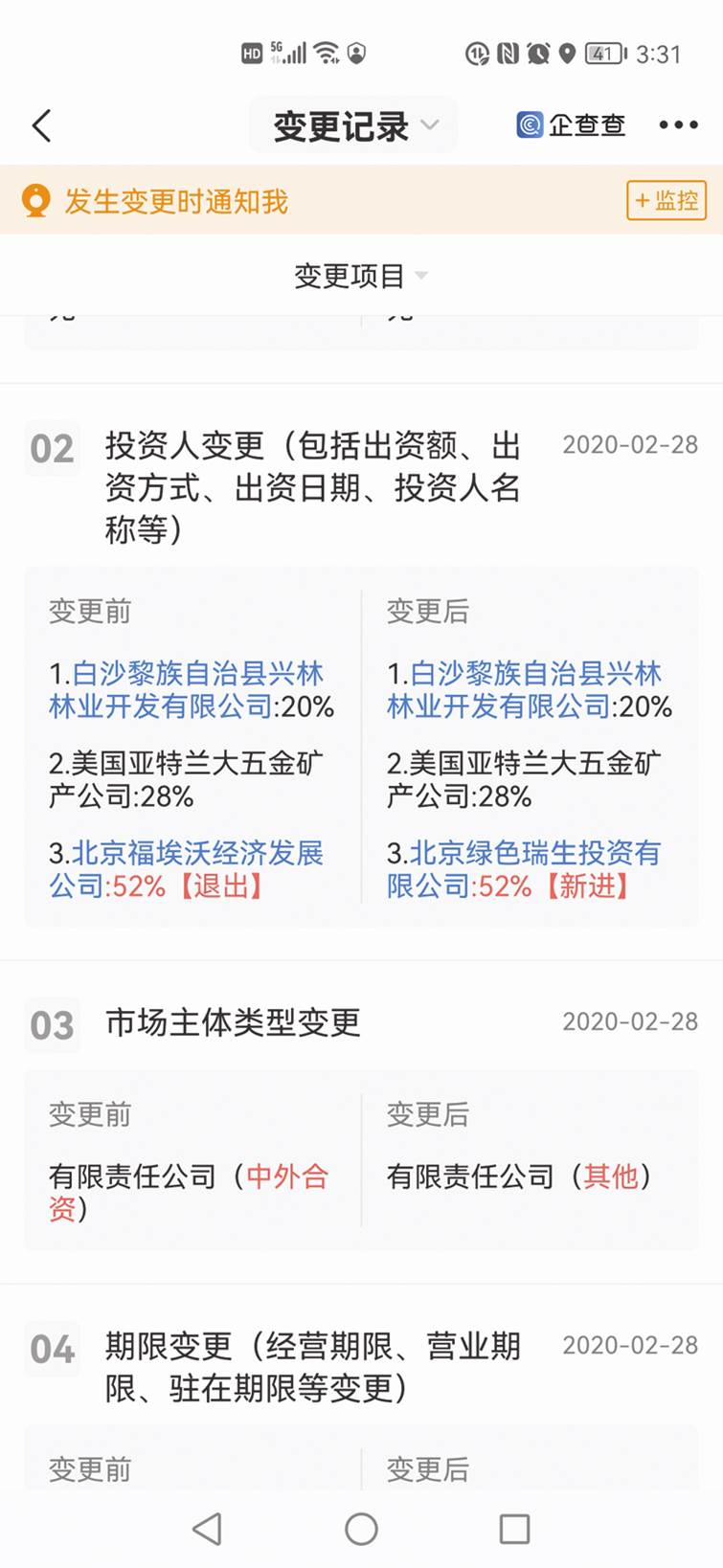 而企查查顯示,彼時的第一大股東海南福萊斯其實在2020年2月之前,其最大股東為北京福埃沃經(jīng)濟發(fā)展公司(見圖二),持有其52%的股份,不過奇怪的是,該企業(yè)于2011年10月被吊銷,其次為美國亞特蘭大五金礦產(chǎn)公司、白沙黎族自治縣興林林業(yè)開發(fā)有限公司,分別占28%和20%的股份。