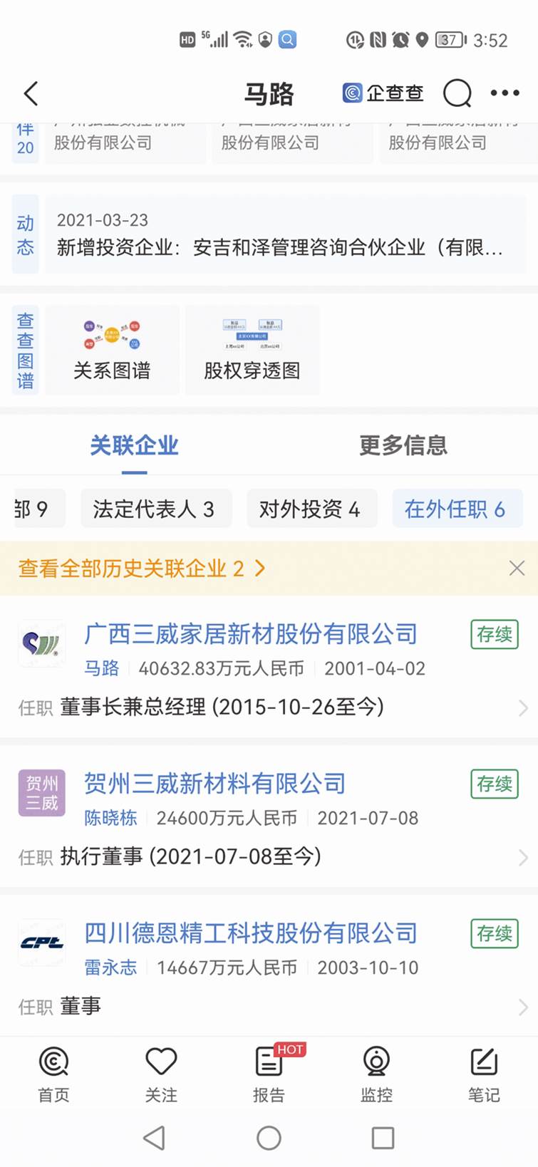 2019年10月,梵谷林業(yè)將其持有三威有限 33.5%的股權(對應出資額7035.00萬元)轉(zhuǎn)讓給梵谷投資,轉(zhuǎn)讓的價格為7035.00萬元。通過企查查查詢的工商信息顯示,鼎惠投資為李茂洪、劉雨華夫婦100%持股,梵谷林業(yè)于2019年12月被注銷,原持股50%的大股東為馬路,現(xiàn)為三威新材的董事長兼總經(jīng)理,其還在公司實控人李茂洪持股的另一家公司德恩精工中擔任董事職務(見圖三)。