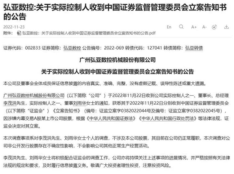 弘亞數(shù)控強調(diào),本次調(diào)查事項系對李茂洪、劉雨華的個人調(diào)查,不涉及弘亞數(shù)控的股票,其目前在弘亞數(shù)控仍正常履職,但本次調(diào)查對弘亞數(shù)控的非公開發(fā)行股票存在不確定性影響。