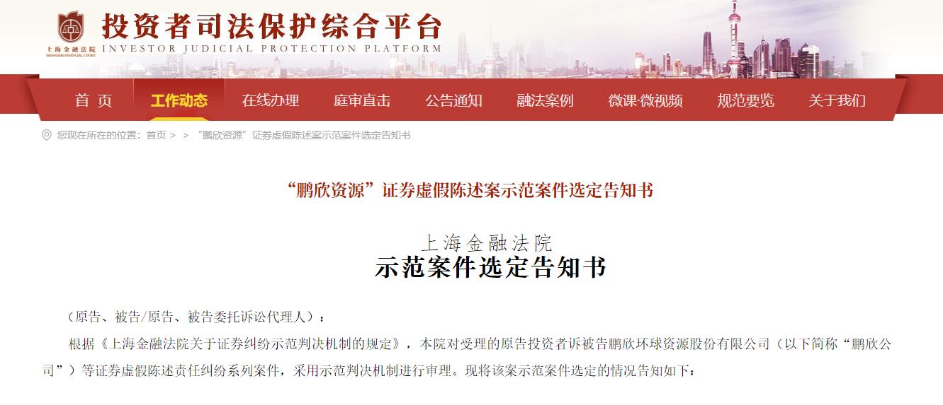 近日,鵬欣資源(600490)投資者索賠案傳來了新進展。據上海金融法院在官網發布的《示范案件選定告知書》顯示,法院對受理的原告投資者訴被告鵬欣資源等證券虛假陳述責任糾紛系列案件,采用示范判決機制進行審理。