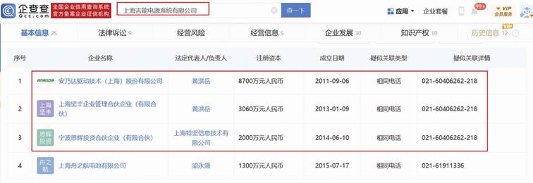 企查查顯示,吉能電源與安乃達電話完全相同,甚至分機號都一模一樣,均為“021-60406262-218”,而安乃達股東上海堅豐企業(yè)管理合伙企業(yè)(有限合伙)、寧波思輝投資合伙企業(yè)(有限合伙)亦是這個電話號碼(見圖一)。