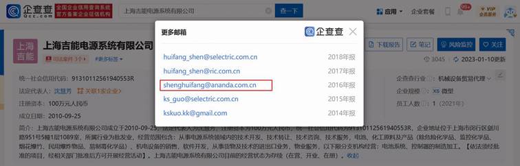 企查查顯示,吉能電源2016年年報郵箱為“shenghuifang@ananda.com.cn” (見圖二),其使用的后綴“@ananda.com.cn”與安乃達郵箱也完全一致,安乃達郵箱為“panyi@ananda.com.cn”。