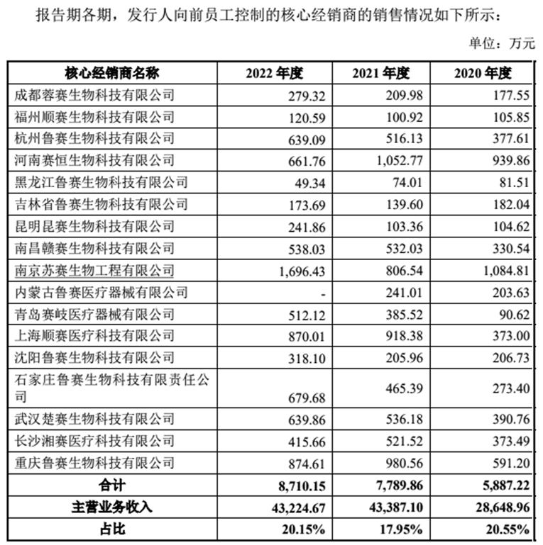賽克賽斯招股書還顯示,報告期內,公司向前員工控制的核心經銷商銷售產品包括賽必妥、瞬時、賽腦寧等產品。2020-2022年,公司向其銷售的上述產品的合計收入占向前員工控制的核心經銷商銷售金額的比例分別為92.33%、92.31%和94.17%。