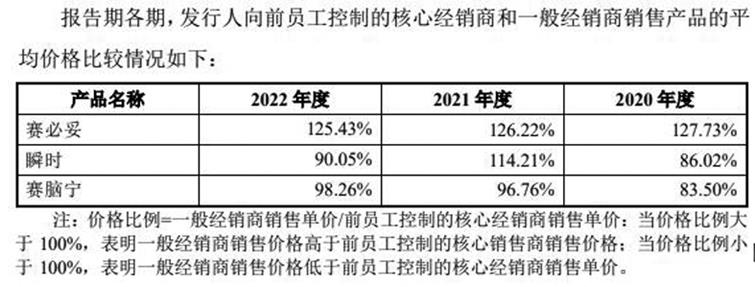 至于公司向前員工控制的核心經銷商和向其他一般經銷商的銷售之間存在的價格差異,賽克賽斯稱:“報告期各期,向核心經銷商銷售賽必妥、瞬時、賽腦寧產品平均價格低于一般經銷商,主要系核心經銷商銷量較大,且該等核心經銷商承擔所在區域推廣、終端客戶的維護與開發等職能,因而銷售單價存在差異具有合理性。其中,2020年度瞬時、賽腦寧產品、2021年度賽腦寧產品、2022年度瞬時、賽腦寧產品向前員工控制的核心經銷商銷售價格高于一般經銷商,主要原因為前員工控制的核心經銷商采購單價高的大規格產品占比較高所致。”