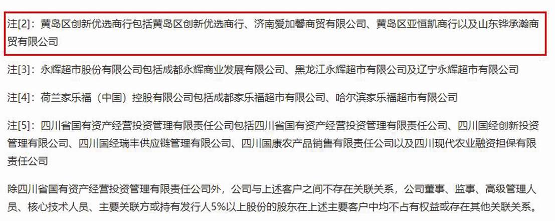 值得注意的是,記者發(fā)稿前翻閱菊樂股份最新招股書時,對比過往招股書,發(fā)現該大客戶同一控制下企業(yè)“突然”多出了2020年10月成立的山東鏵承瀚商貿有限公司(見圖二)。因為此前在菊樂股份2022年披露的招股書中,黃島區(qū)創(chuàng)新優(yōu)選商行還只是“包括黃島區(qū)創(chuàng)新優(yōu)選商行、濟南愛加馨商貿有限公司以及黃島區(qū)亞恒凱商行”。(見圖七)