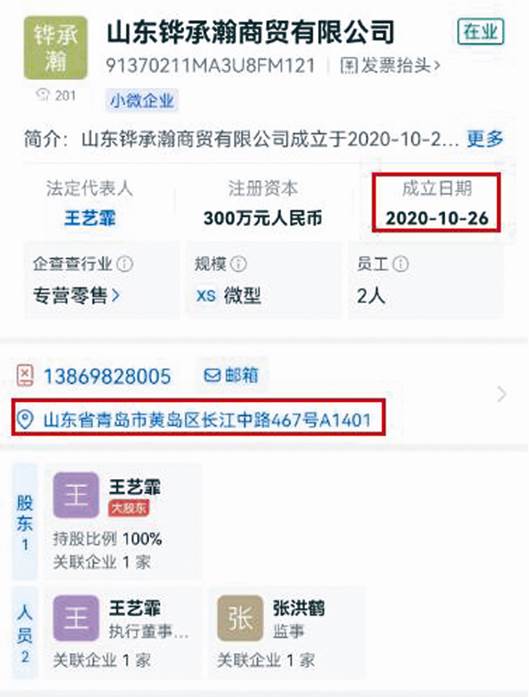 黃島區(qū)創(chuàng)新優(yōu)選商行同一控制下的另外三家企業(yè)大部分的成立時間也都在2020年四季度。黃島區(qū)亞恒凱商行成立于2020年11月19日,經營者為白璐。山東鏵承瀚商貿有限公司成立于2020年10月26日,法定代表人、唯一股東、執(zhí)行董事均為王藝霏,張洪鶴為監(jiān)事(見圖四)。只有2014年4月18日成立的濟南愛加馨商貿有限公司經營時間較長,法定代表人、唯一股東、執(zhí)行董事均為張加艷,楊光遠為監(jiān)事。