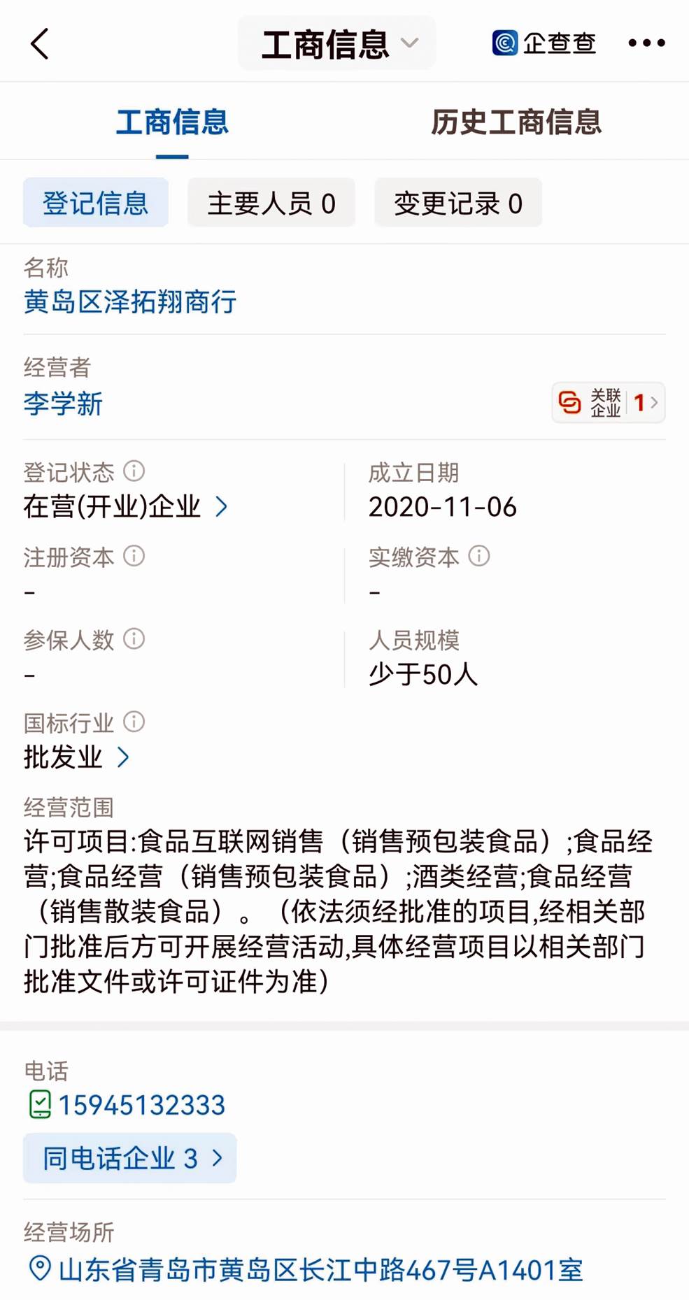 黃島區(qū)創(chuàng)新優(yōu)選商行的成立時間頗令人側目——通過企查查查詢的工商信息顯示,黃島區(qū)創(chuàng)新優(yōu)選商行于2020年12月17日成立,經營者為張洪鶴(見圖三)。