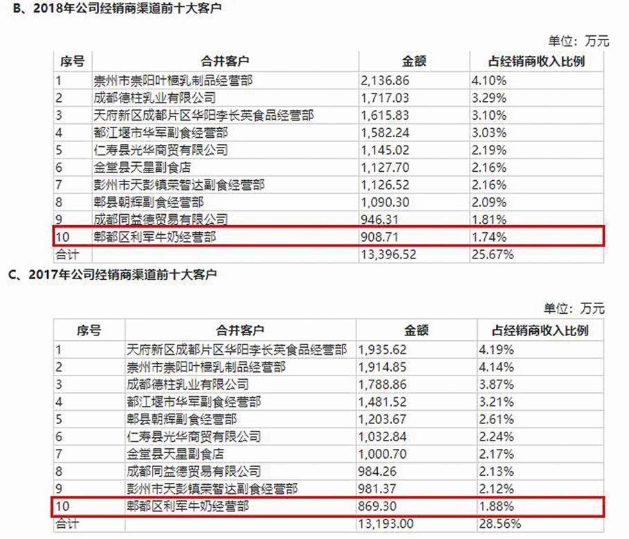 也就是說,2017年11月才成立的郫都區(qū)利軍牛奶經營部,用2個月就完成了老牌經銷商華陽經銷商鐘德金半年的銷售額,也接近了自身次年的銷售額。疑問油然而生——這是否正常?郫都區(qū)利軍牛奶經營部是否與其他老牌渠道經銷商或公司存在特殊關系,公司對于郫都區(qū)利軍牛奶經營部又是否存在未披露情形?