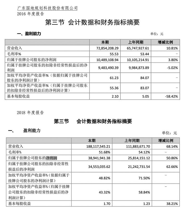 記者查詢以往業績發現,國地科技2016年以來業績持續增長,但2019年之前凈利潤遠未達到5000萬元。新三板掛牌期間年報顯示,國地科技2016-2018年凈利潤依次為1048.91萬元、2581.41萬元、3894.19萬元(見圖一)。