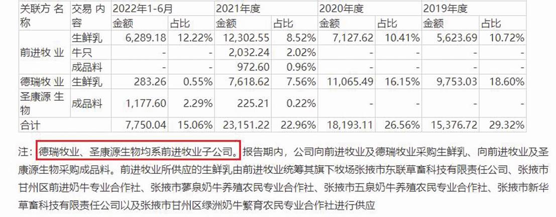值得注意的是,基于審慎原則,前進(jìn)牧業(yè)被菊樂(lè)股份認(rèn)定為關(guān)聯(lián)企業(yè)。因?yàn)椤扒斑M(jìn)牧業(yè)系公司于2015年開(kāi)始合作的北方規(guī)模化牧場(chǎng),公司在與前進(jìn)牧業(yè)前期良好合作的基礎(chǔ)上,基于戰(zhàn)略合作及保障生鮮乳供應(yīng)穩(wěn)定性等考慮,于2017年以參股方式與前進(jìn)牧業(yè)設(shè)立德瑞牧業(yè),并于2021年以控股方式與前進(jìn)牧業(yè)設(shè)立蜀漢牧業(yè)。”