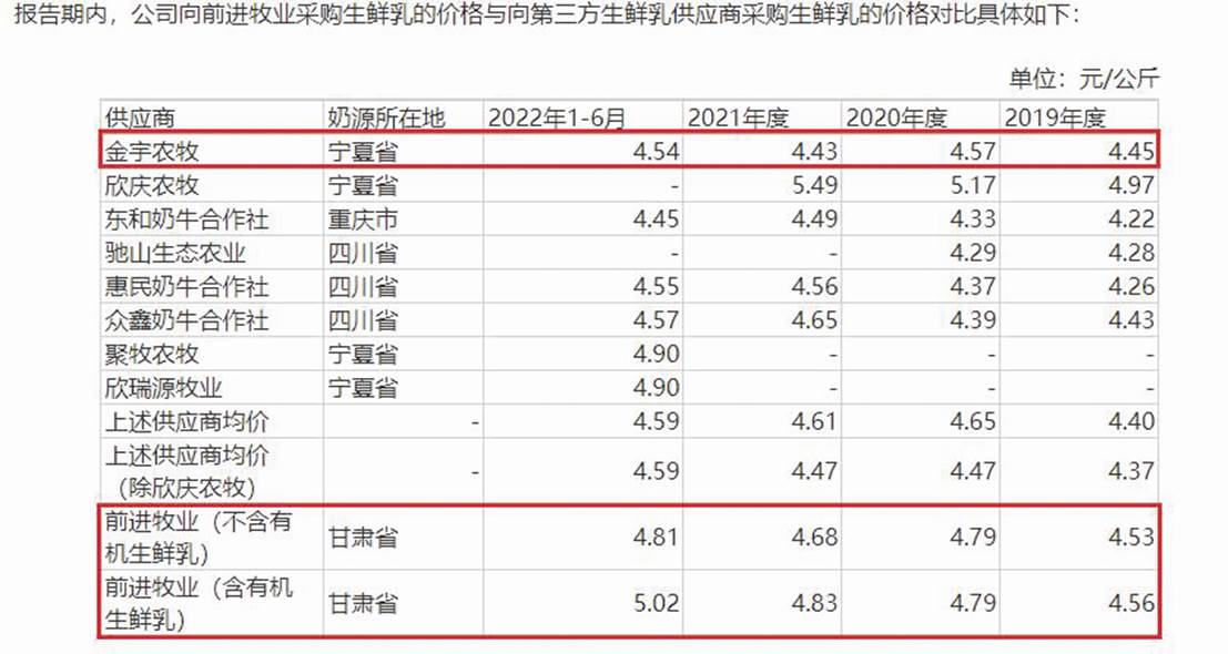 不過(guò)需要注意的是,位于寧夏的金宇農(nóng)牧,采購(gòu)價(jià)卻與位于甘肅的前進(jìn)牧業(yè)相差較大。例如2021年,公司向金宇農(nóng)牧采購(gòu)價(jià)為4.43元/公斤,向前進(jìn)牧業(yè)不含有機(jī)生鮮乳的采購(gòu)價(jià)則是4.68元/公斤,相差5%以上,2020年也低了近5%。同時(shí),金宇農(nóng)牧與前進(jìn)牧業(yè)的長(zhǎng)期合同定價(jià)機(jī)制、結(jié)算方式一致,并且都屬于北緯“黃金奶源帶”的張掖市、吳忠市等地。