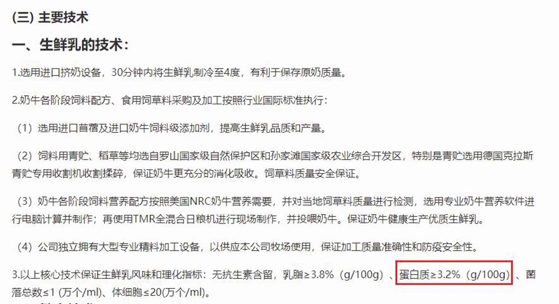 新三板企業(yè)金宇農(nóng)牧今年4月發(fā)布的2022年年報(bào)在披露生鮮乳技術(shù)時(shí)介紹,通過(guò)核心技術(shù)保證生鮮乳中的蛋白質(zhì)≥3.2%(g/100g)(見(jiàn)圖五),即乳蛋白含量在3.2克/100克及以上。記者2023年5月4日下午登錄前進(jìn)牧業(yè)控股股東前進(jìn)集團(tuán)(全名甘肅前進(jìn)現(xiàn)代農(nóng)業(yè)發(fā)展集團(tuán)有限公司)的官網(wǎng)(http://www.qjmyjt.com),根據(jù)其官網(wǎng)對(duì)自家三種常溫液態(tài)奶產(chǎn)品的介紹,計(jì)算發(fā)現(xiàn)乳蛋白含量均在3.2克/100克左右(見(jiàn)圖六)。