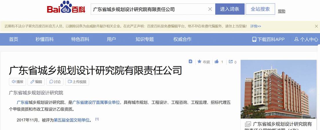 圖五:百度百科關于廣東省城鄉規劃設計研究院有限責任公司的介紹