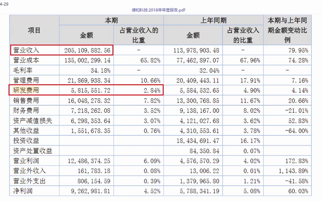 德和科技2018年年報顯示,2018年,公司實現營業收入20510.99萬元,研發費用為581.56萬元,占營業收入的比重為2.84%。(見圖一)