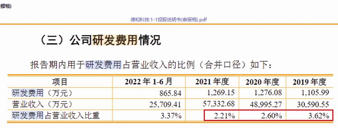 招股書顯示,2019-2021年,德和科技用于研發費用占營業收入的比例依次為3.62%、2.60%和2.21%。(見圖二)