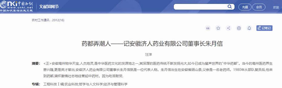 此前,中國農(nóng)業(yè)農(nóng)村部主管、中國農(nóng)村雜志社主辦的農(nóng)業(yè)類期刊《農(nóng)村工作通訊》2012年第16期刊登過標(biāo)題為《藥都弄潮人——記安徽濟人藥業(yè)有限公司董事長朱月信》的文章(見圖二),稱其“1980年從部隊復(fù)員后,他來到藥都(即亳州),滿懷激情壯志地經(jīng)營起中藥材”。“2001年春,朱月信創(chuàng)辦的濟人藥業(yè)有限公司投產(chǎn)了”。“他以雄厚的實力和過人的膽略收購了蚌埠第七制藥廠,并在亳州進行了易地重建?!?/p>