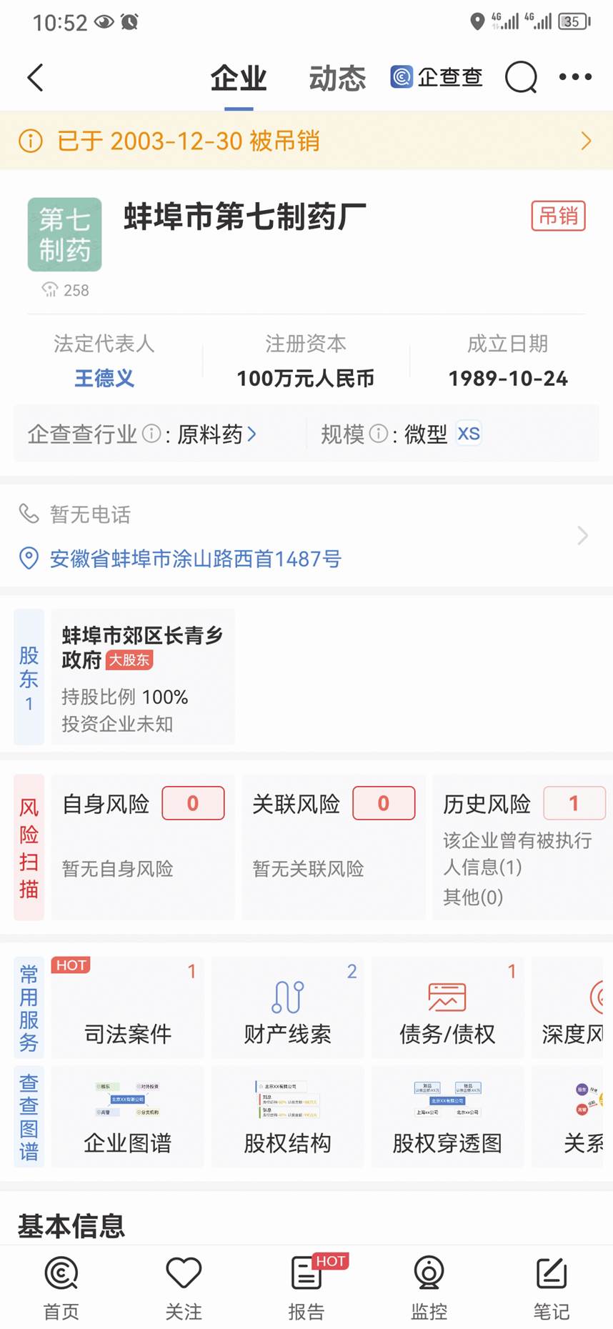 企查查信息顯示,1989年10月成立、性質(zhì)為集體所有制的蚌埠第七制藥廠,于2003年12月30日被吊銷,但目前未注銷(見圖三)。