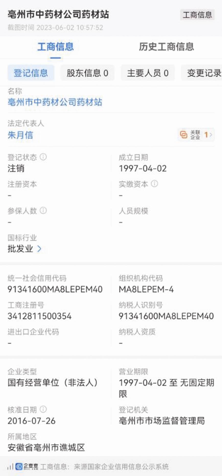 進一步查詢顯示,1997年4月2日成立、2016年7月26日注銷的亳州市中藥材公司藥材站,法定代表人也叫朱月信。工商信息更顯示,該企業(yè)性質(zhì)為國有非法人經(jīng)營單位(見圖四),即無獨立法人資格的國有經(jīng)營單位。事實上,該企業(yè)為亳州地方國企亳州市中藥材公司的分支機構(gòu)。以此來看,這位朱月信應(yīng)當(dāng)是亳州市中藥材公司的員工,擔(dān)任了亳州市中藥材公司藥材站的法定代表人。而且該藥材站沒有發(fā)生過工商變更登記。