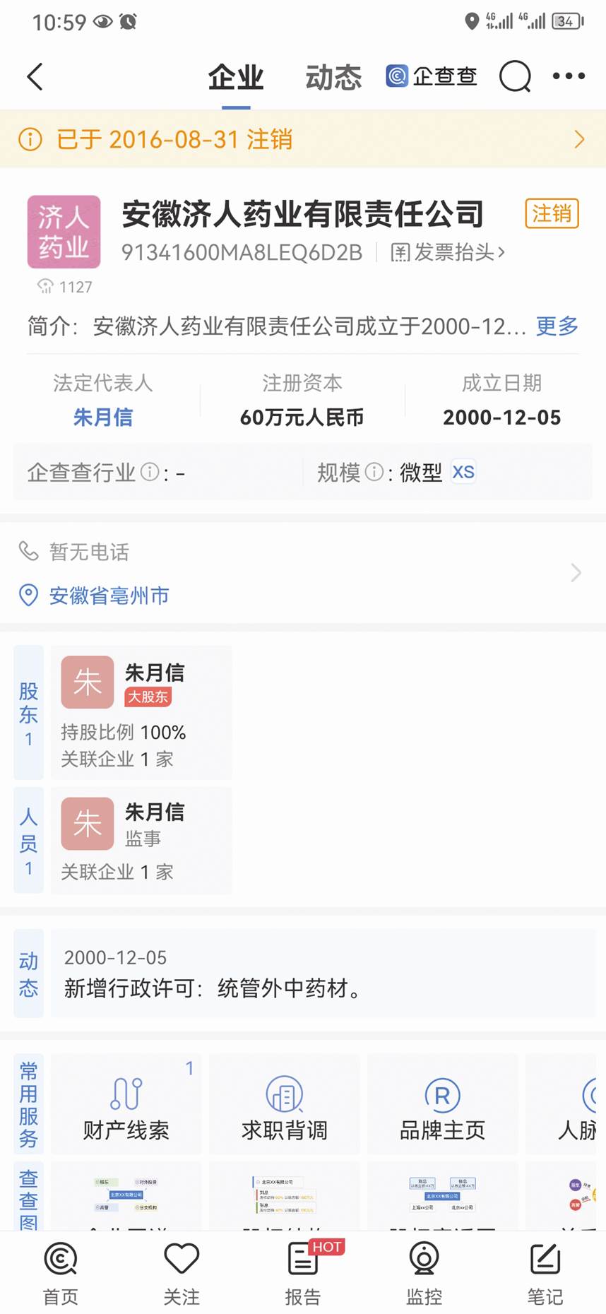 此外,2000年12月5日成立的安徽濟人藥業(yè)有限責(zé)任公司,2016年8月31日注銷,該企業(yè)唯一股東也叫朱月信(見圖五)。企查查顯示該企業(yè)存續(xù)期間也未發(fā)生過工商變更登記。