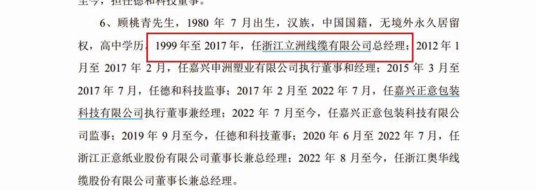 2023年3月披露的簡歷顯示:“顧桃青,1980年7月出生,漢族,中國國籍,無境外永久居留權,高中學歷。1999年至2017年,任浙江立洲線纜有限公司總經理;2012年1月至2017年2月,任嘉興申洲塑業有限公司執行董事和經理;2015年3月至2017年7月,任德和科技監事;2017年2月至2022年7月,任嘉興正意包裝科技有限公司執行董事兼經理;2022年7月至今,任嘉興正意包裝科技有限公司監事;2019年9月至今,任德和科技董事;2020年6月至2022年7月,任浙江正意紙業股份有限公司董事長兼總經理;2022年8月至今,任浙江奧華線纜股份有限公司董事長兼總經理。”(見圖一)