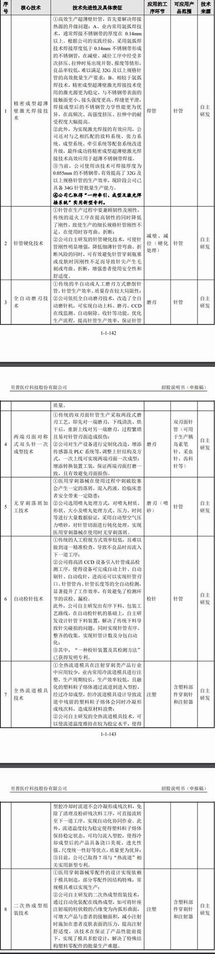 招股書披露,貝普醫(yī)療披露的核心技術共有8項,分別為精密成型超薄壁激光焊接技術、針管硬化技術、全自動磨刃技術、兩端刃面對稱式雙頭針一次成型技術、無穿刺落屑加工技術、自動檢針技術、全熱流道模具技術、二次熱成型組裝技術。