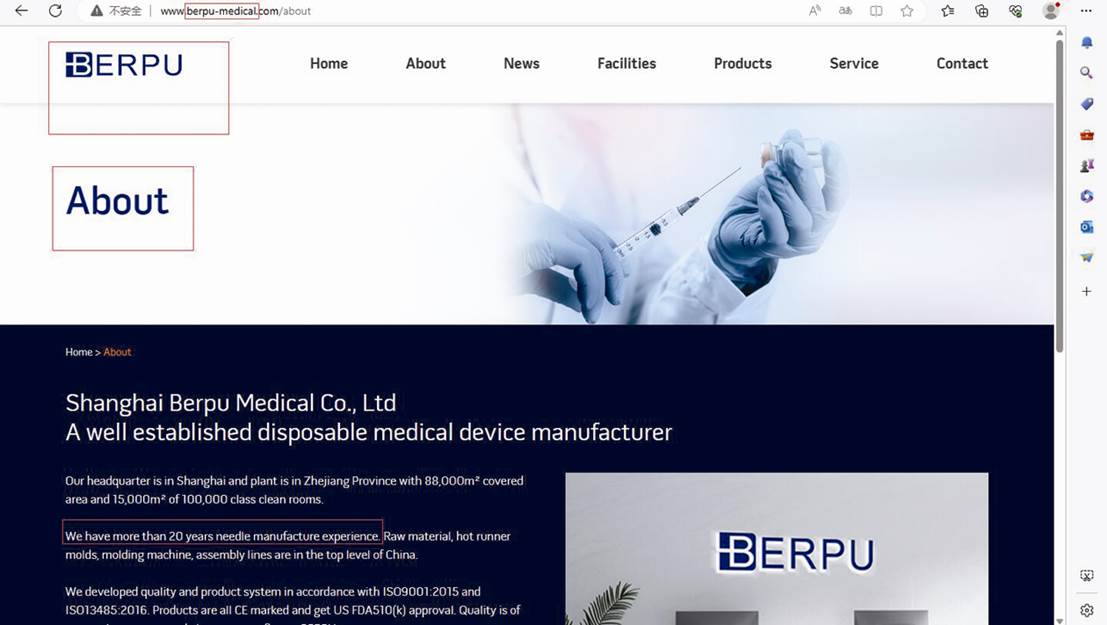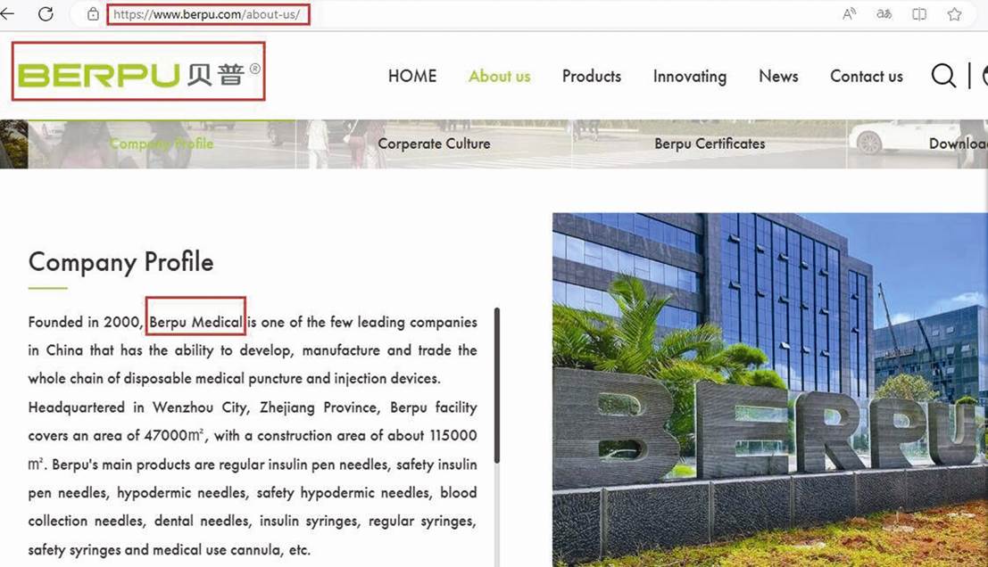 打開上海貝樸進出口的公司官網http://www.berpu-medical.com,可以發現,該企業英文名稱中的Berpu Medical極易讓人將該企業和貝普醫療英文名混為一體,其網頁更介紹(見圖三):Our headquarter is in Shanghai and plant is in Zhejiang Province with 88,000m2 covered area and 15,000m2 of 100,000 class clean rooms.We have more than 20 years needle manufacture experience.