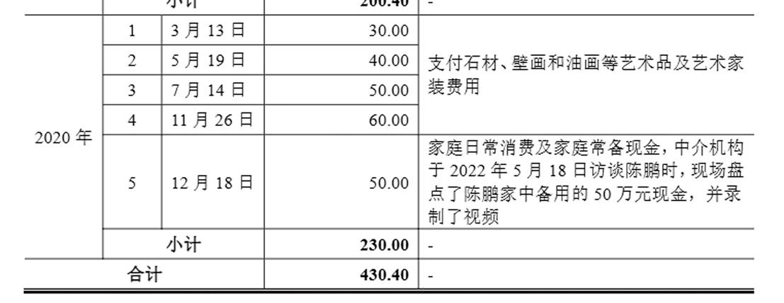 招股書披露,公司實際控制人陳鵬平時具有使用現金消費的習慣,以及在特定場景下具備使用現金的需求,其中,2019年2月20日取現的30萬元主要用于元宵節活動發放員工動員紅包、家庭日常消費和常備現金等;2019年4月17日至2020年11月26日期間取現的350.40萬元主要用于支付石材、壁畫和油畫等藝術品及藝術家裝費用;2020年12月18日取現的50萬元用于家庭日常消費及家庭常備現金。