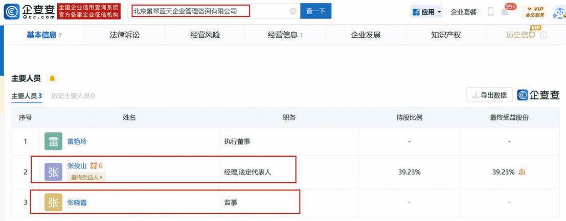 此外,張俊山擔任經理、法人的北京景翠藍天企業管理咨詢有限公司,監事為張曉霞。
